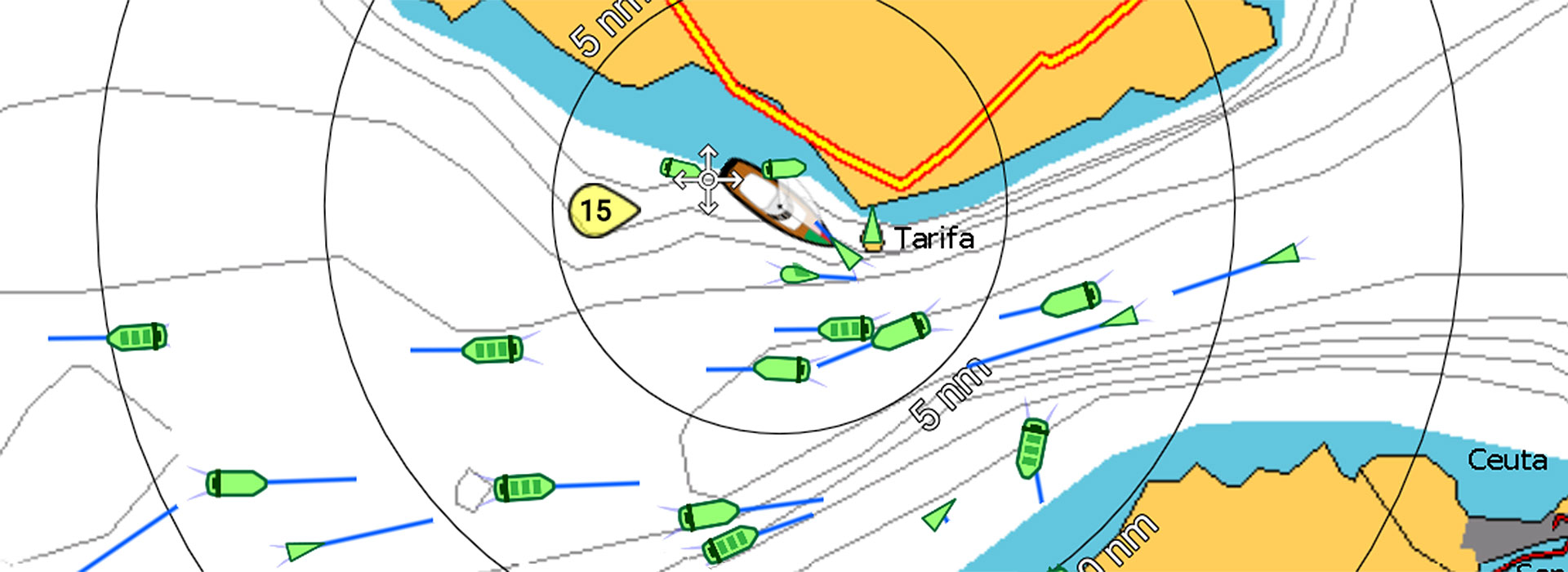 Interessant ist in dem Zusammenhang die Einstellung der sogenannten Vektorlänge. Hierbei wird eine Zeit festgelegt und die Länge des Vektorpfeils sagt dann aus, welche Strecke in der festgelegten Zeit zurückgelegt wird. Wird die Zeit beispielsweise mit 12 Minuten eingestellt, wird das entsprechende Fahrzeug den Punkt an der Pfeilspitze in 12 Minuten erreicht haben. Diese Information ist äußerst hilfreich, wenn es darum geht, die Gefahr von Kollisionen einzuschätzen.