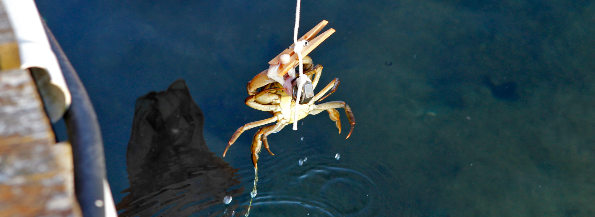 Wenn der Krebs angebissen hat, ziehen wir ihn langsam hoch. Wenn du zu schnell ziehst, lässt der Krebs wieder los. Manche Krebse lassen auch los, wenn sie aus dem Wasser kommen. Ich halte dann einen Kescher unter den Krebs, damit er in den Kescher fällt. Manchmal macht das auch mein Bruder.