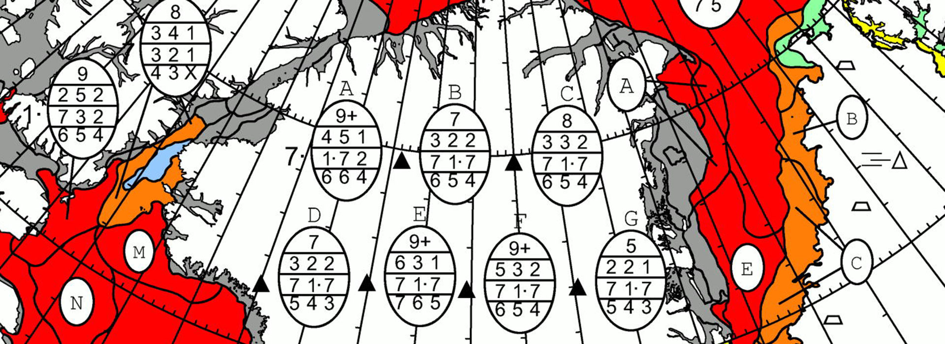 Konkret steht die (7.) für vereinzelt auftretendes, altes Eis, das mindestens zwei Jahre alt und dicker als 2 Meter ist. Die (9) steht für vereinzelt auftretendes, dünnes Eis im zweiten Stadium, das mindestens ein Jahr alt ist und etwa 70 bis 120 Zentimeter dick ist.