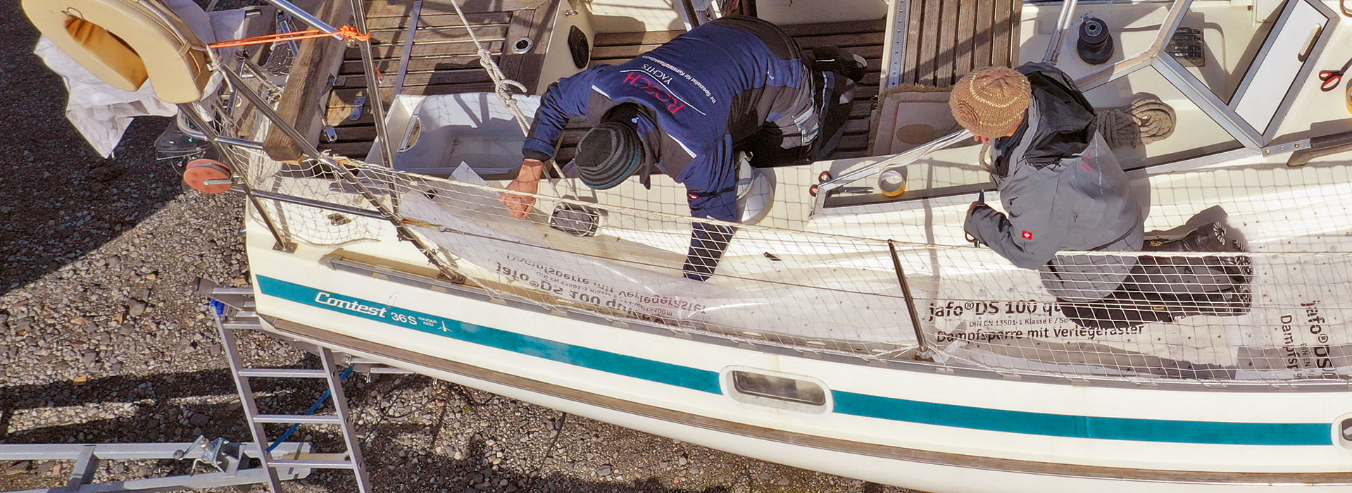Das Anfertigen einer Schablone ist kein Hexenwerk und kann auch vom Laien durchgeführt werden. Zudem spart es am Ende bares Geld. Wenn das Boot nicht gerade in einer Halle steht, würde ich mir einen windstillen, trockenen Tag aussuchen und mindestens eine weitere Person dabeihaben wollen. Bei etwas Wind helfen auch kleinere Gewichte zum Beschweren der Folie, sollte das doppelseitige Klebeband nicht ausreichen.
