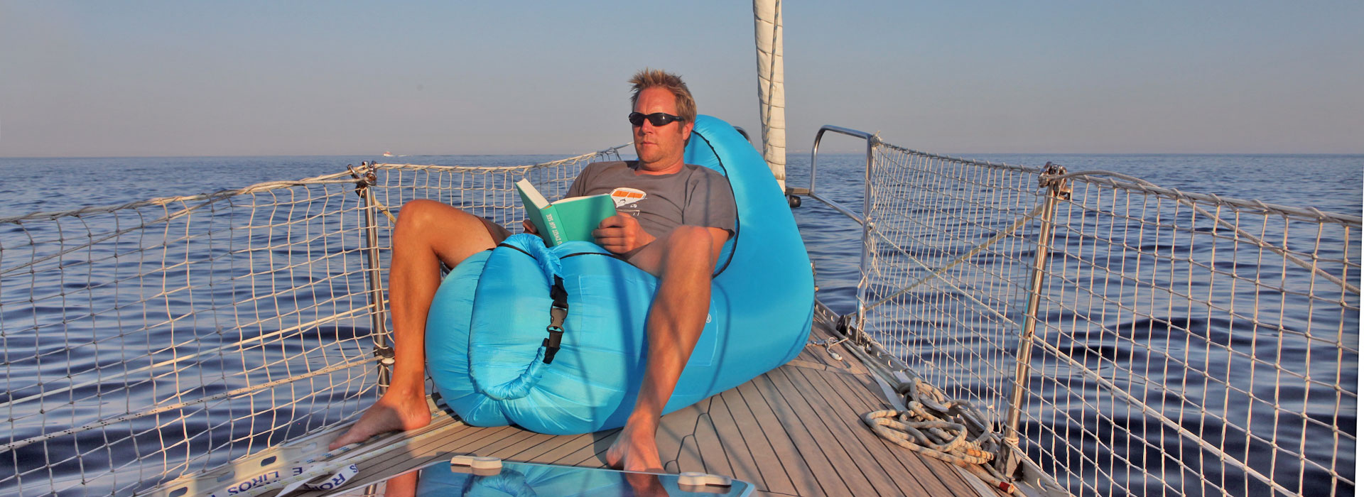 Wir nutzen das Luftsofa hauptsächlich auf dem Vorschiff zum Abhängen mit einem guten Buch in der Hand oder beim Sundowner als Lounge-Möbel. Wobei das nicht ganz richtig ist, denn genau genommen haben wir zwei Luftsofas an Bord. Das erlaubt es jedem von uns, in einem eigenen Luftsofa zu sitzen. Da das Luftsofa schnell auf- und wieder abgebaut ist, kommt es bei uns regelmäßig zum Einsatz. Die Technik ist schnell zu erlernen und mit etwas Übung dauert es nur ein paar Minuten.
