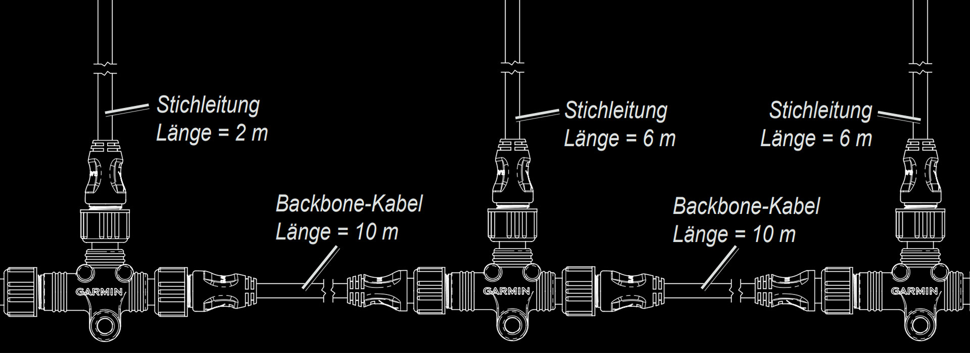 Der Kabelwiderstand wird vom Hersteller angegeben, ein Garmin-Kabel hat beispielsweise einen Widerstand von 0,053 Ohm. Bei der Distanz von der Batterie zum entferntesten Gerät müssen, neben der Backboneleitung, auch die Stichleitung und das Stromkabel berücksichtigt werden. Die Netzbelastung kann durch die von den Geräteherstellern angegebene Load Equivalency Number (LEN-Wert) ermittelt werden. Die Summe der LEN-Werte der im Netzwerk installierten Geräte ergibt die Netzbelastung.