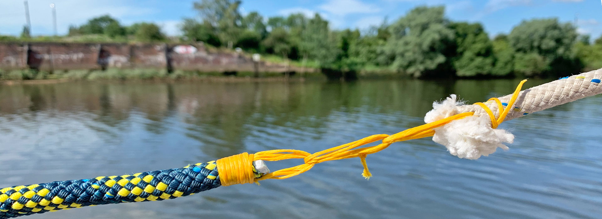 Das Verbinden der Schlaufen geht am besten mit gewachstem Takelgarn. Das ist etwas klebrig, sodass die Knoten gut halten. Wer Sorge hat, dass sich was löst, kann diese Verbindung mit einem Tape zusätzlich sichern. Wir verzichten darauf inzwischen.