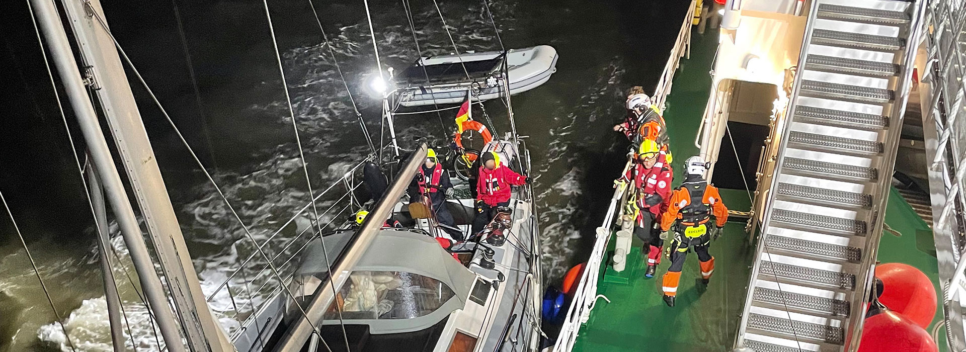 Gegen 19.30 Uhr traf die HERMANN MARWEDE an der Yacht ein. Um angesichts der groben See keinerlei Risiken für Schiff und Besatzung einzugehen, entschieden die Seenotretter, den Havaristen zunächst noch ein Stück bis in die Jademündung zu begleiten, wo mit weniger Seegang zu rechnen war.