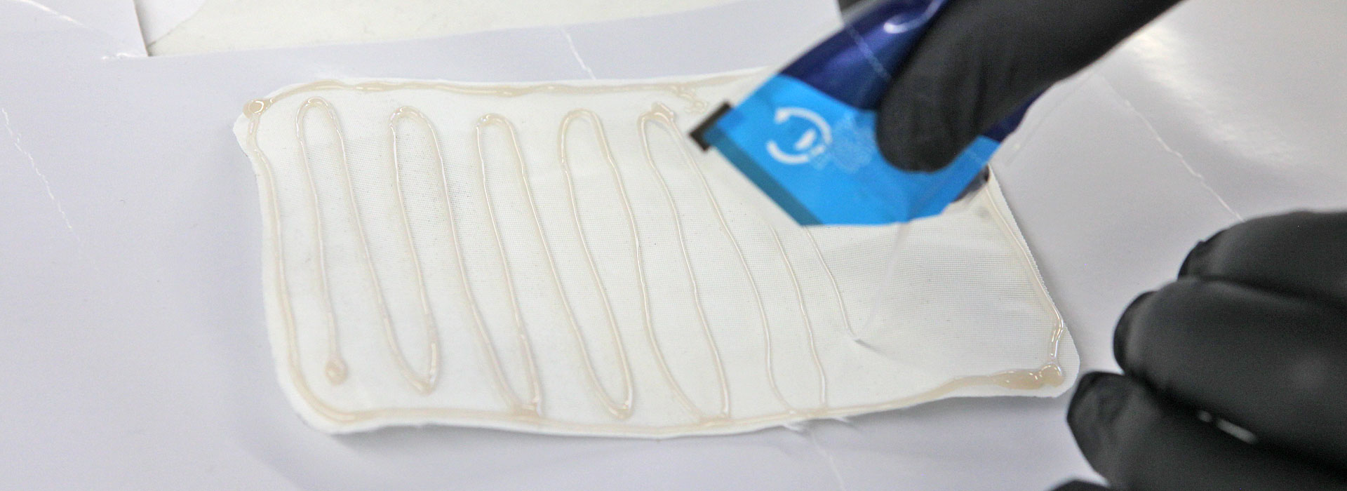 Der Inhalt wird in Bahnen auf den Aufkleber aus Segeltuch aufgetragen.