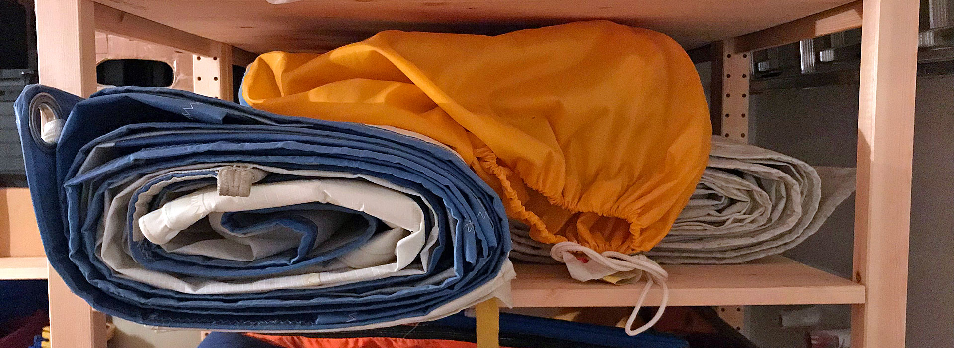 Weichere Tourensegel können übrigens gestapelt werden. Laminat-Segel hingegen sollten locker gelegt werden. Harte Regattasegel wiederum sollten knickfrei in gerolltem Zustand eingelagert werden, da durch das Knicken die Fasern brechen können.