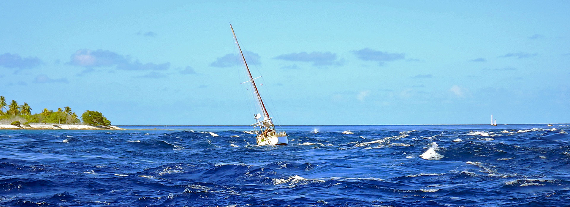 Achtung! Niemals in ein Atoll ein- oder auslaufen, wenn kräftiger Wind gegen die Strömung steht. Dann können sich je nach Strom- und Windstärke ziemlich gefährliche Verwirbelungen und stehende Wellen aufbauen! Auch sind bei auflandigem Wind Grundseen und Brecher möglich.