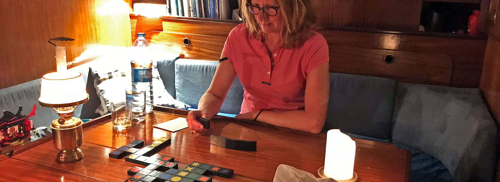 Wenn am Ankerplatz Ruhe einkehrt oder der Regen im Hafen auf das Deck prasselt, ist bei uns an Bord Spiele-Zeit. Wir mögen Gesellschaftsspiele. Egal, ob meine Frau und ich zu zweit unterwegs sind oder mit Freunden – bei uns an Bord sind immer Spiele dabei. Und so sitzen wir des Öfteren am Abend zusammen und spielen im Schein der Petroleumlampe.